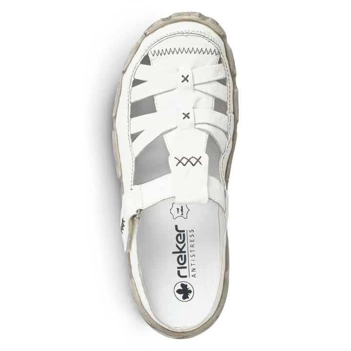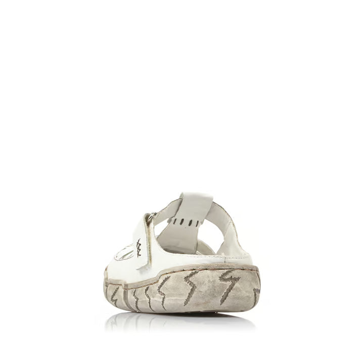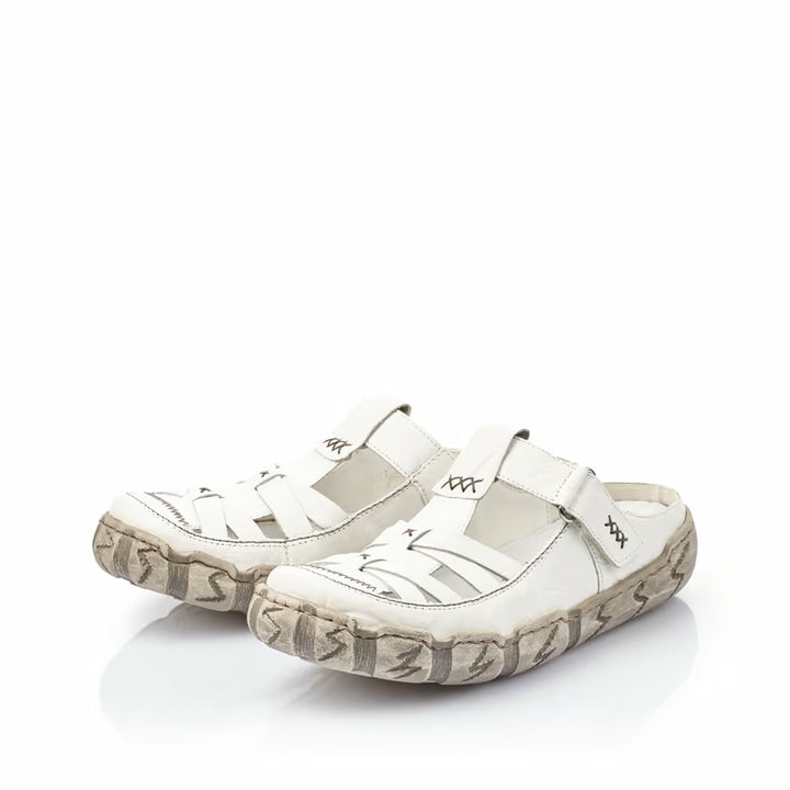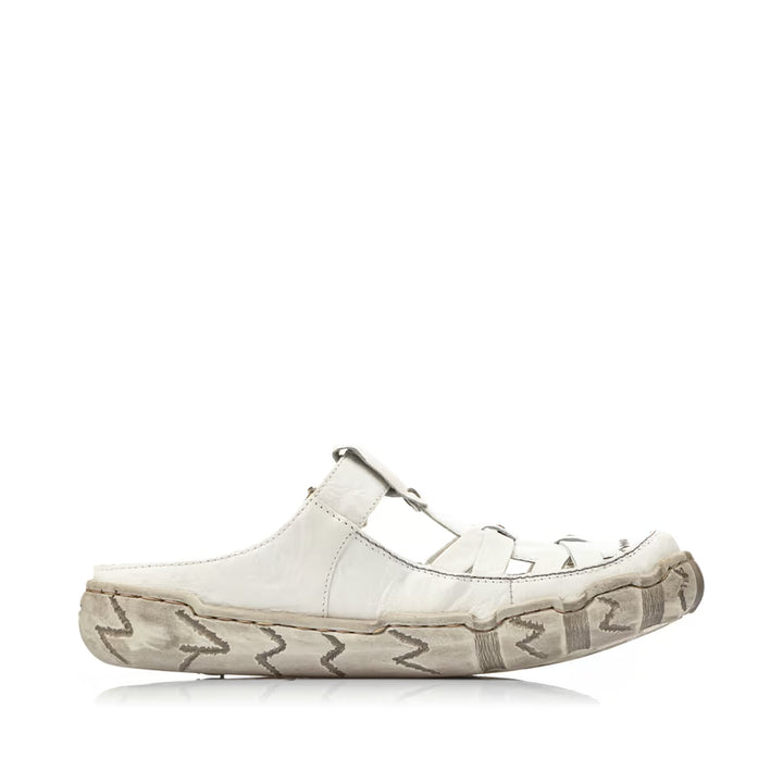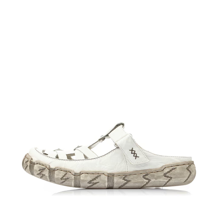 Easy walking, easy living! Diese weißen Rieker Clogs für Damen aus Glattleder überzeugen mit einem klassischen Design und hohem Komfort. Die Anflechter-Machart macht diesen Schuh zu einem besonders langlebigen und biegsamen Begleiter. Die Clogs sind dank einem Klettverschluss in Nullkommanichts angezogen. Die handgestickten Nähte runden das moderne Design perfekt ab. Die schockabsorbierende und leichte Sohle mit Keilabsatz sorgt für ein angenehmes Tragegefühl. Außerdem ist die Decksohle extra weich. Alles in einem – top!