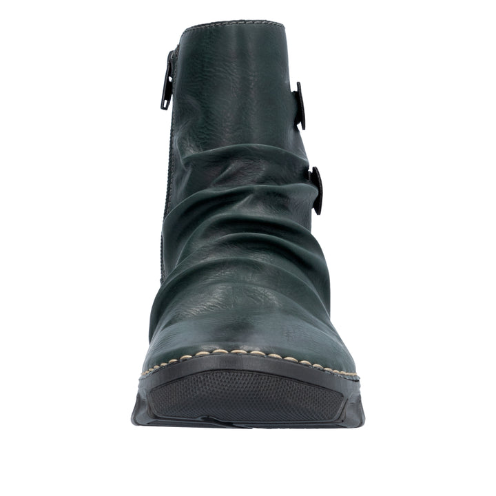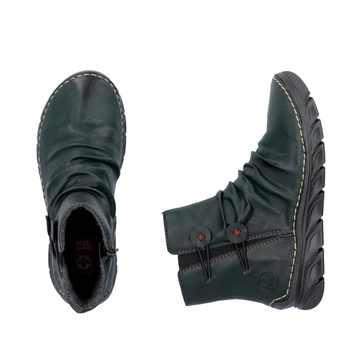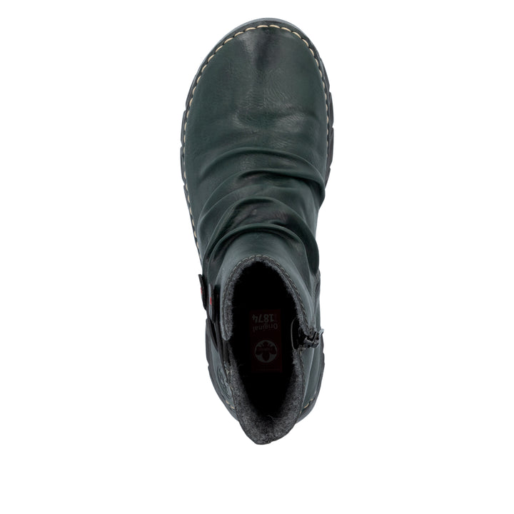 Diese dunkelgrünen Rieker Stiefel für Damen sehen nicht nur stylisch aus, sondern sorgen dank ihrer Qualität auch für den gewissen Komfort im Alltag. Diese modernen Stiefeletten in einem ansprechenden dunkelgrün sind aus hochwertigem Synthetik material gefertigt und zeichnen sich durch ihre hellen Ziernähte aus, die dem Schuh eine raffinierte Note verleihen. Dank der Anflechter-Machart ist dieser Schuh besonders widerstandsfähig und flexibel. Durch den Reißverschluss kann der Schuh ganz schnell angezogen werden. Die geraffte Optik sorgt für das perfekte Finish und einen auffallenden Look. Die schockabsorbierende und sehr leichte Sohle bietet besten Laufkomfort und die extra weiche Decksohle ist ein weiteres Plus. Alles in einem – top!