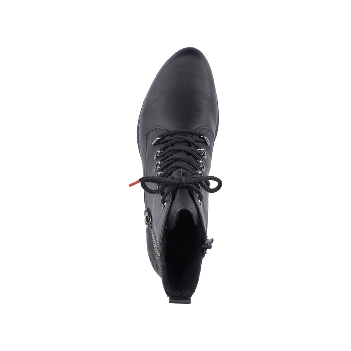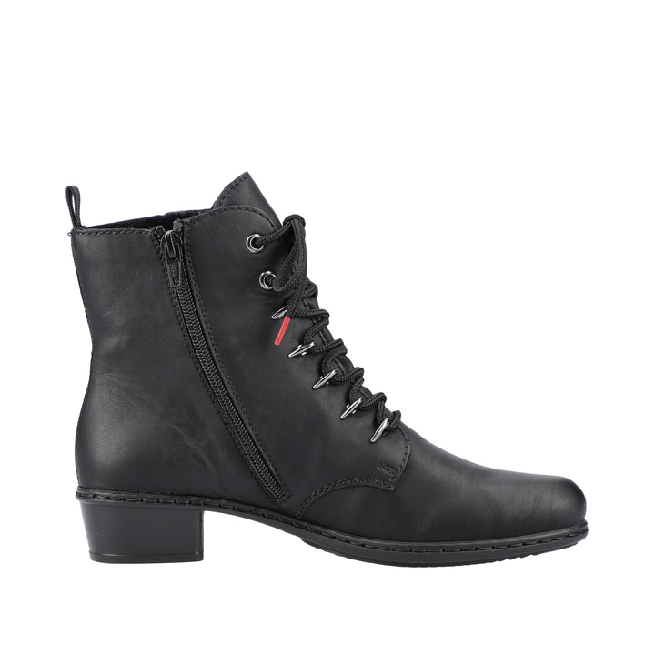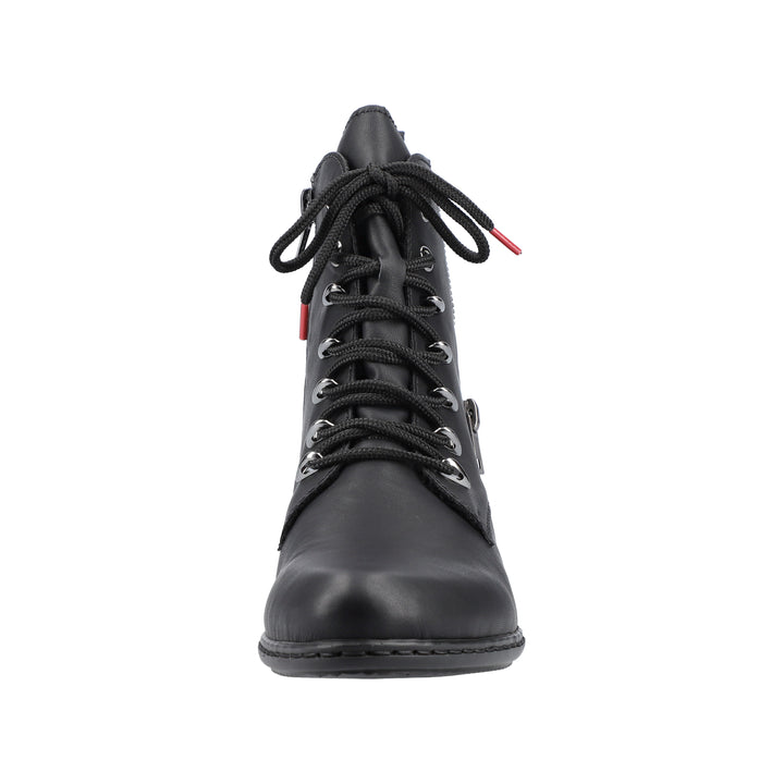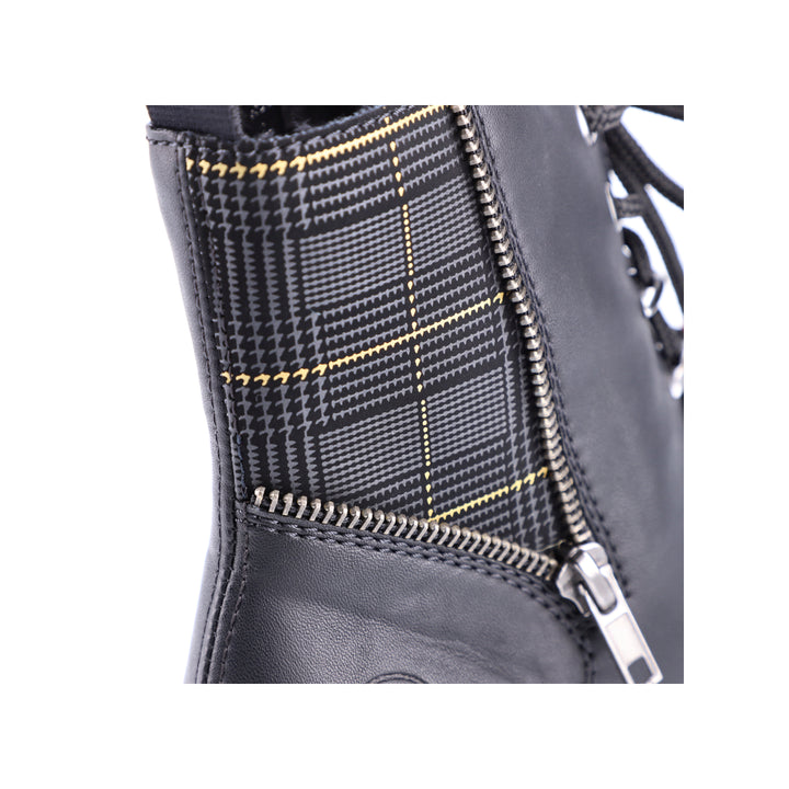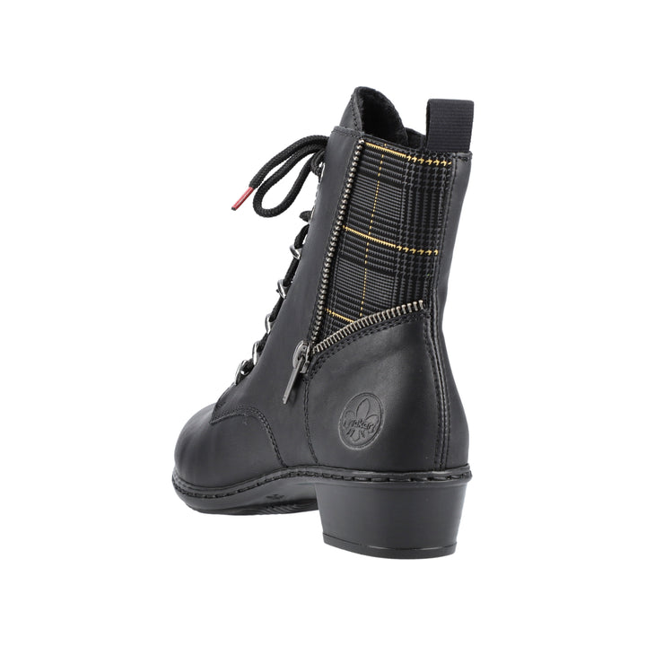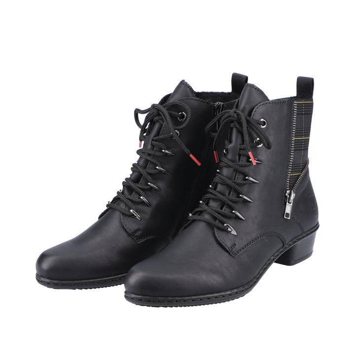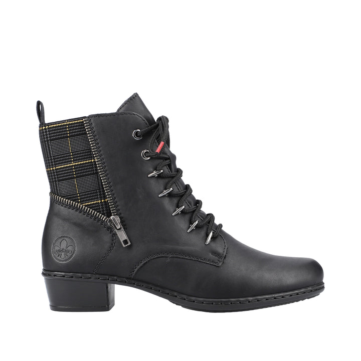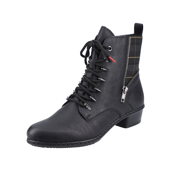 Diese schwarze Rieker Stiefelette für Damen überzeugt durch modernes Design und hohen Tragekomfort. In der Anflechter-Machart gefertigt, ist das Modell robust, flexibel und bietet eine perfekte Passform. Die stilvollen Ösen setzen das Design modisch in Szene. Trotz Schnürung kann der Schuh ganz einfach mit einem Reißverschluss geschlossen werden. Das modische Karomuster ist ein hübsches Detail. Die leichte und schockabsorbierende Sohle mit Blockabsatz verwöhnt die Füße darüber hinaus bei jedem Schritt. Wohlgefühl inklusive!