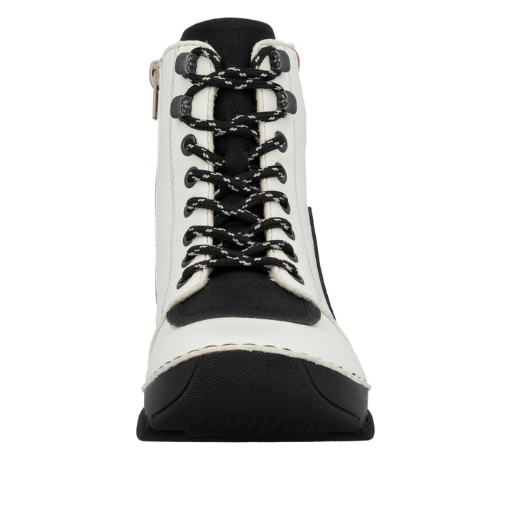 Maximaler Komfort auf Schritt und Tritt! Diese weißschwarzen Rieker Schnürstiefel für Damen wurden aufwendig verarbeitet. In der Anflechter-Machart gefertigt, ist das Modell robust, flexibel und bietet eine perfekte Passform. Die geniale Kombination aus Schnürung und Reißverschluss ermöglicht ein einfaches An- und Ausziehen. Mit der leichten und schockabsorbierenden Sohle werden deine Füße bei jedem Schritt verwöhnt und die extra weiche Decksohle sorgt für mehr Tragekomfort. Deine Best-Buddies für die neue Saison!