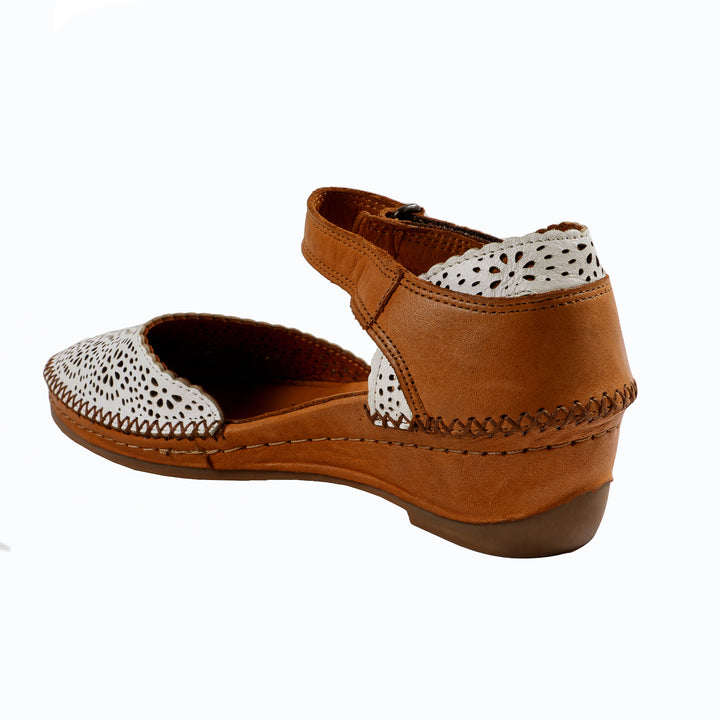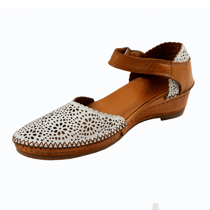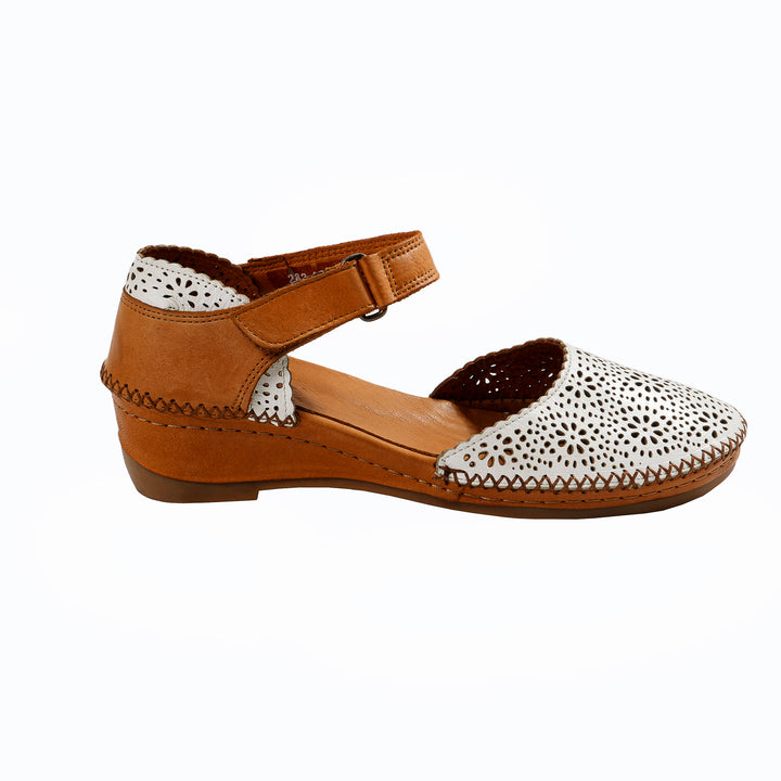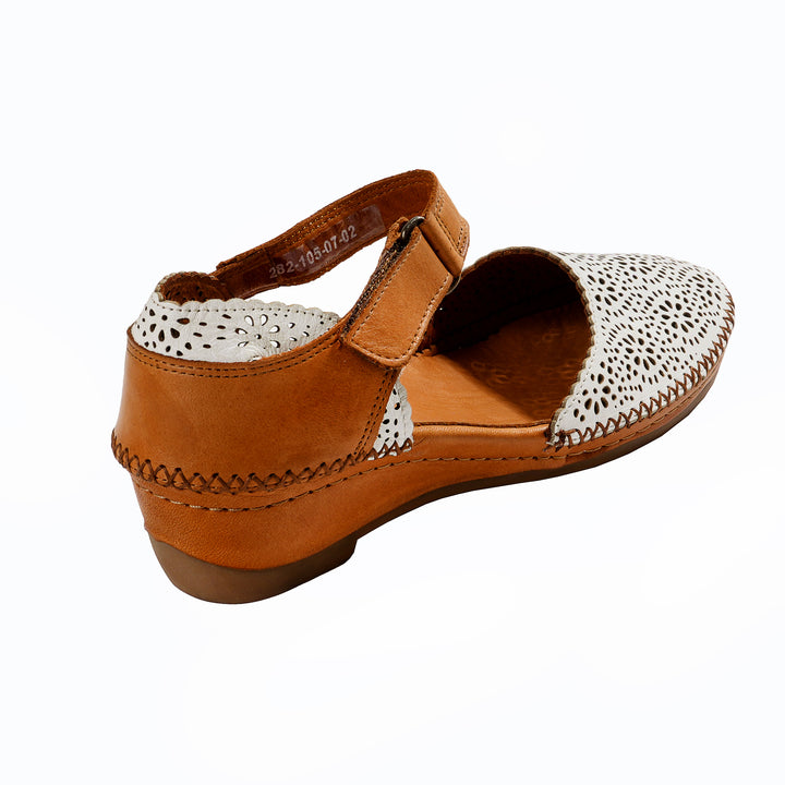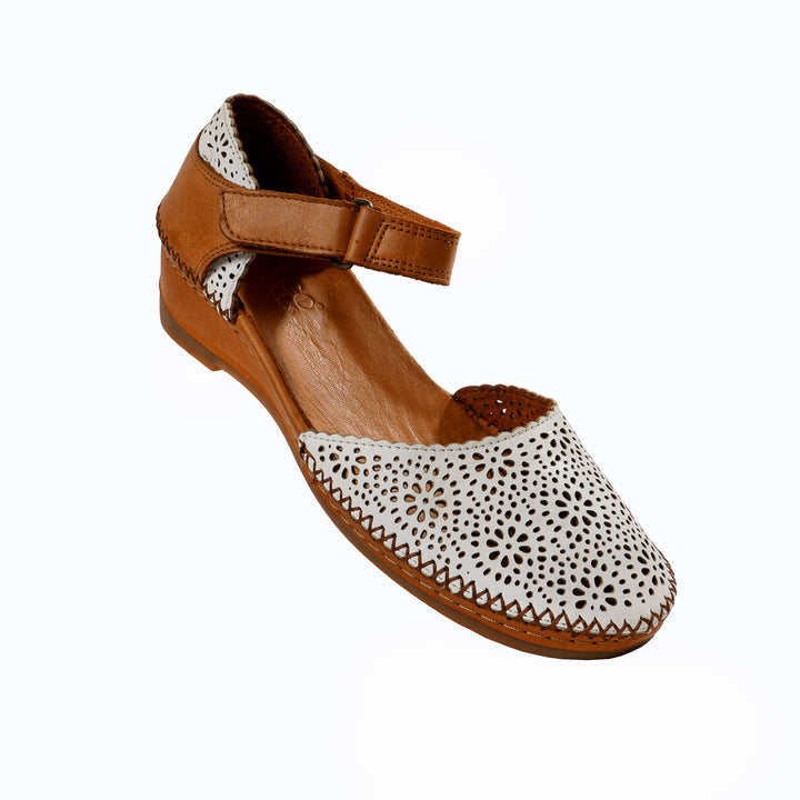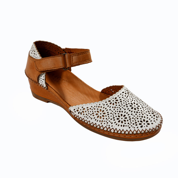Diese Damensandalen aus echtem Leder in Weiß bestechen durch ihr auffälliges Obermaterial mit Lochmuster. Die abgerundete Spitze und der kontrastierende braune Besatz unterstreichen den sommerlichen Look dieses Modells. Ein Klettverschluss erleichtert das Anziehen und Anpassen. Innen verwöhnt ein weiches Lederfutter zusammen mit dem gepolsterten Lederfußbett den Fuß bei jedem Schritt.